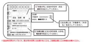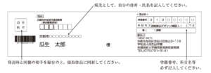 送り主住所/電話番号/氏名/学籍番号/科目名/第○課題/提出回数(「初回提出」もしくは「再提出」と記入)
