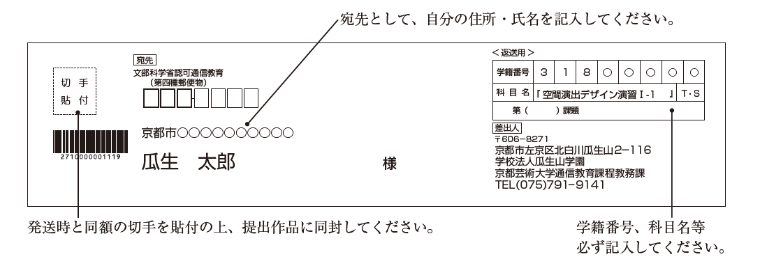 1.梱包材(封筒・箱等)※1 2.作品提出用宛名シール※1 3.提出時の送料相当の切手 4.作品返却用宛名シール※1 5.返送時の送料相当の切手 6.ほかシラバス「初回提出物(一括発送)」の指定物 ※大学専用封筒を使用し提出する場合、2は不要。返送封筒は大学側で用意のため同封不要です。 ※窓口提出の場合、2・3は不要 |