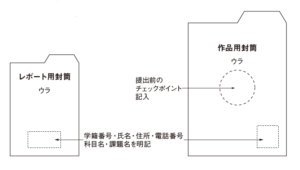 返送先住所/電話番号/氏名/学籍番号/科目名/第○課題/提出回数(「初回提出」もしくは「再提出」と記入)