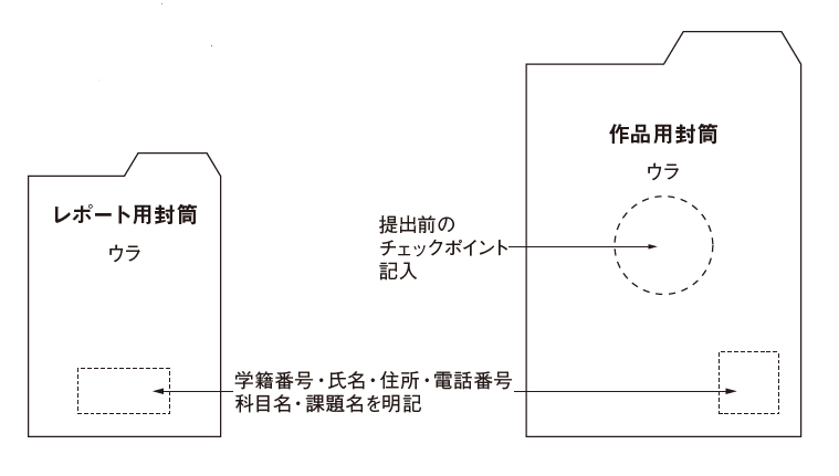 折り畳み可能な作品課題の場合はレポート提出専用封筒を使用してください。 大型の平面作品(ファイルやイラストボード等)の場合は作品送付用大型封筒を使用してください。 ![]() |